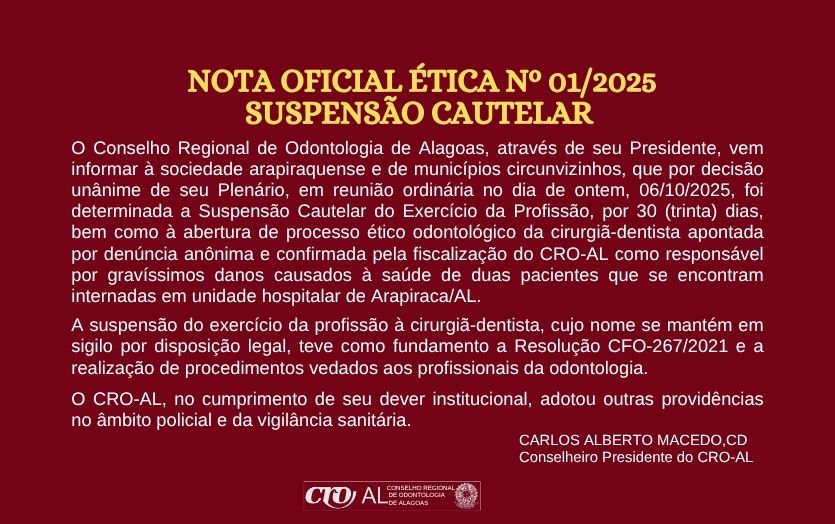 Descrição: O CRO-AL determinou a suspensão cautelar de 30 dias e a abertura de processo ético contra uma cirurgiã-dentista em Arapiraca/AL, após denúncia confirmada pela fiscalização. A medida segue a Resolução CFO-267/2021 e inclui providências junto à polícia e à vigilância sanitária.